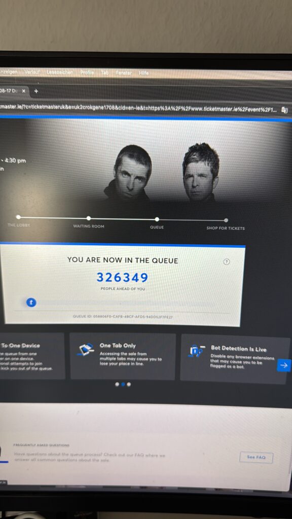 Ab 08:00 Uhr konnte man sich bereits in die Online-Warteschlangen stellen. Das war also noch Zuhause am PC möglich. Unsere Entscheidung fiel auf die Konzerte in Dublin und London, für die wir versuchen wollen Karten zu bekommen.