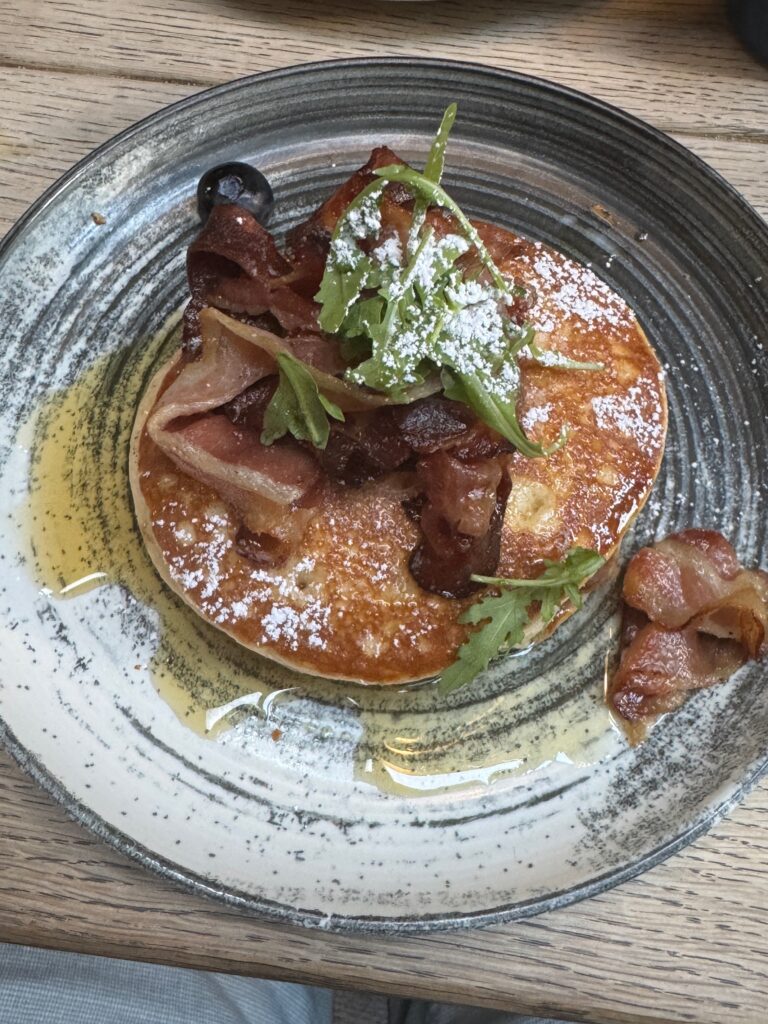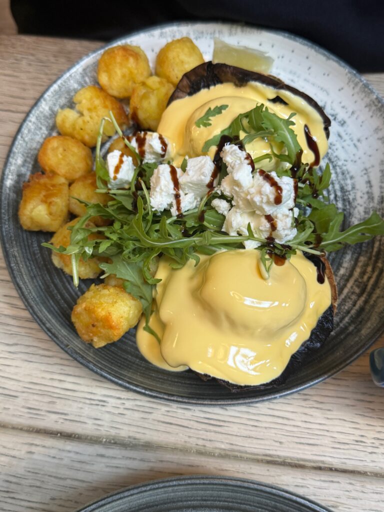 Abflug um 08:50 – auf den Ohren natürlich die offizielle Setlist-Playlist auf Spotify. Man muss ja die Texte zumindest ein bisschen kennen. Und kurz vor 10:00 Uhr Ortszeit waren wir auch schon mitten in London! Und Achtung, Full Circle Moment – es gab Eggs Benedict. Genau wie am Vorverkaufstag ein Jahr zuvor!